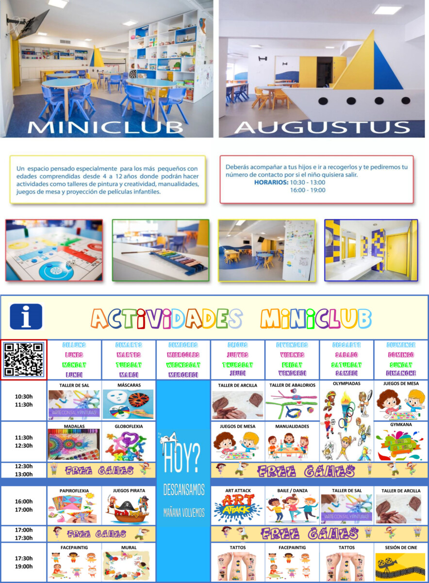 Consulte programa de actividades para niños y adultos en nuestras cartelera situada frente al restaurante y al lado de la sala de juegos.